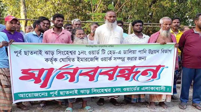 নীলফামারীর ডিমলা উপজেলার পূর্ব ছাতনাই ইউনিয়নের ঝাড় সিংহেশ্বর ১নং ওয়ার্ড টি হেড-এ ডালিয়া পানি উন্নয়ন বিভাগ কর্তৃক ঘোষিত ইমারজেন্সি ওয়ার্ক সম্পন্ন করার জন্য মানববন্ধন করেন এলাকাবাসী।
