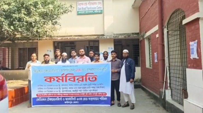 সারা দেশের ন্যায় ফরিদপুরেও মেডিকেল টেকনোলজিস্ট ও ফার্মেসিস্টদের দশম গ্রেড বাস্তবায়নের দাবিতে ২ ঘন্টা কর্মবিরতি ও মানববন্ধন অনুষ্ঠিত হয়।