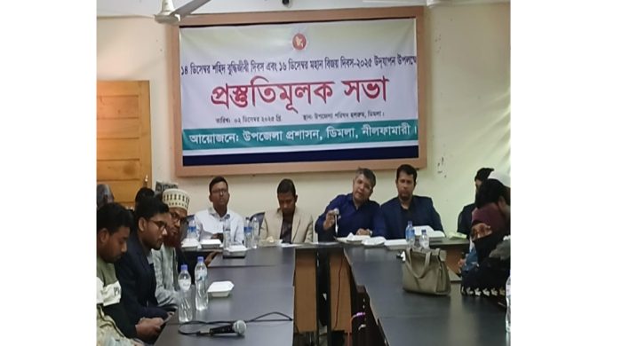 নীলফামারীর ডিমলা উপজেলায় ১৪ ডিসেম্বর শহীদ বুদ্ধিজীবী দিবস ও ১৬ ডিসেম্বর মহান বিজয় দিবস–২০২৫ যথাযথ মর্যাদায় উদযাপন উপলক্ষে এক প্রস্তুতিমূলক সভা অনুষ্ঠিত হয়েছে।